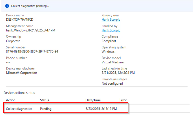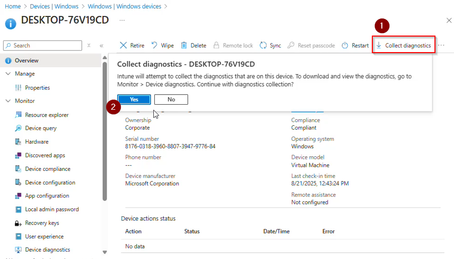 - In the Intune portal, search for your device and in the Overview section. Click Collect diagnostics then Yes to agree.