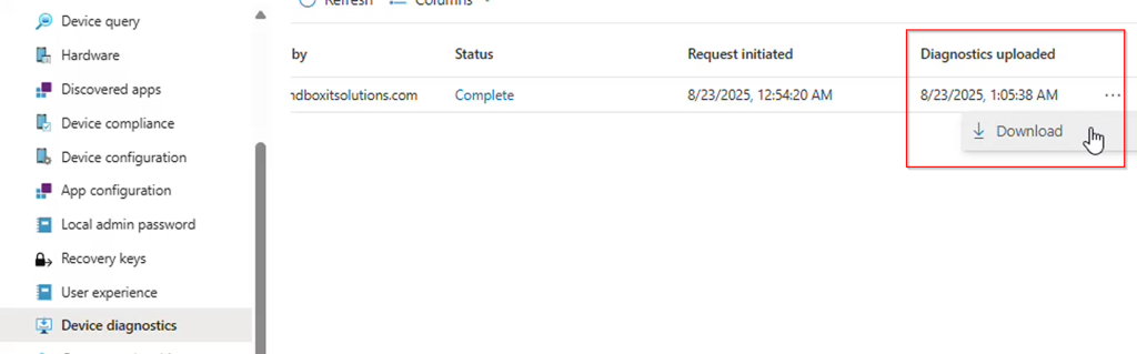 - Once the diagnostics are ready, go to Device diagnostics. Click on the 3 dots (…) and click Download. A zip/cab file will be downloaded onto your device.